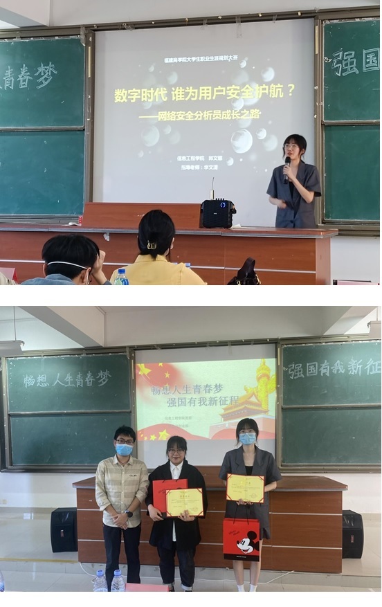 在演讲环节,12位参赛选手依次上台,结合自己的专业及个人兴趣,将自己的职业生涯规划娓娓道来。网络安全工程师、车联网工程师......一个一个新型且结合专业的职业让人眼前一新。在答辩环节,评委老师对每一位选手提出了相应的问题,同时对选手演讲表现和演讲内容的不足之处都逐一进行了指正。比赛最后,评委老师们指出,作为信工学子,应主动把自己的前途同国家的发展相结合,敢于交流,勇于竞争,以赛促学,以赛促进,向优秀更进一步。