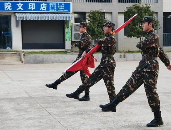 伴随着清晨第一缕阳光,国旗护卫队迈着铿锵有力的步伐护送国旗走向升旗台,伴随着庄严的国歌旋律,鲜艳的五星红旗在晨风中冉冉升起,全体师生齐声高唱国歌,行注目礼,衷心的祝愿伟大祖国繁荣昌盛。