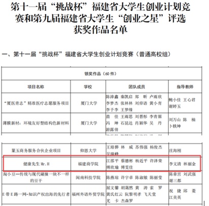 由团省委、省教育厅、省人社厅、省科协、省学联联合举办,阳光学院、共青团福州市委承办的第十一届“挑战杯”福建省大学生创业计划竞赛已落下帷幕,开元参赛项目《健康先生Mr.H》荣获银奖。