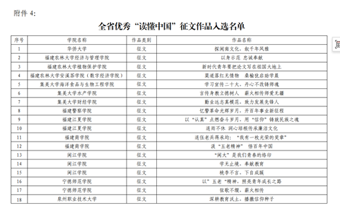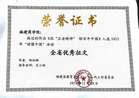 近日,福建省教育系统关心下一代工作委员会公布2023年全省“读懂中国”活动获奖作品名单,开元集团网站关工委推送的《汲“五老精神” 悟百年中国》(作者:郑怡琳,指导老师:艾小林)获评为全省优秀征文作品。